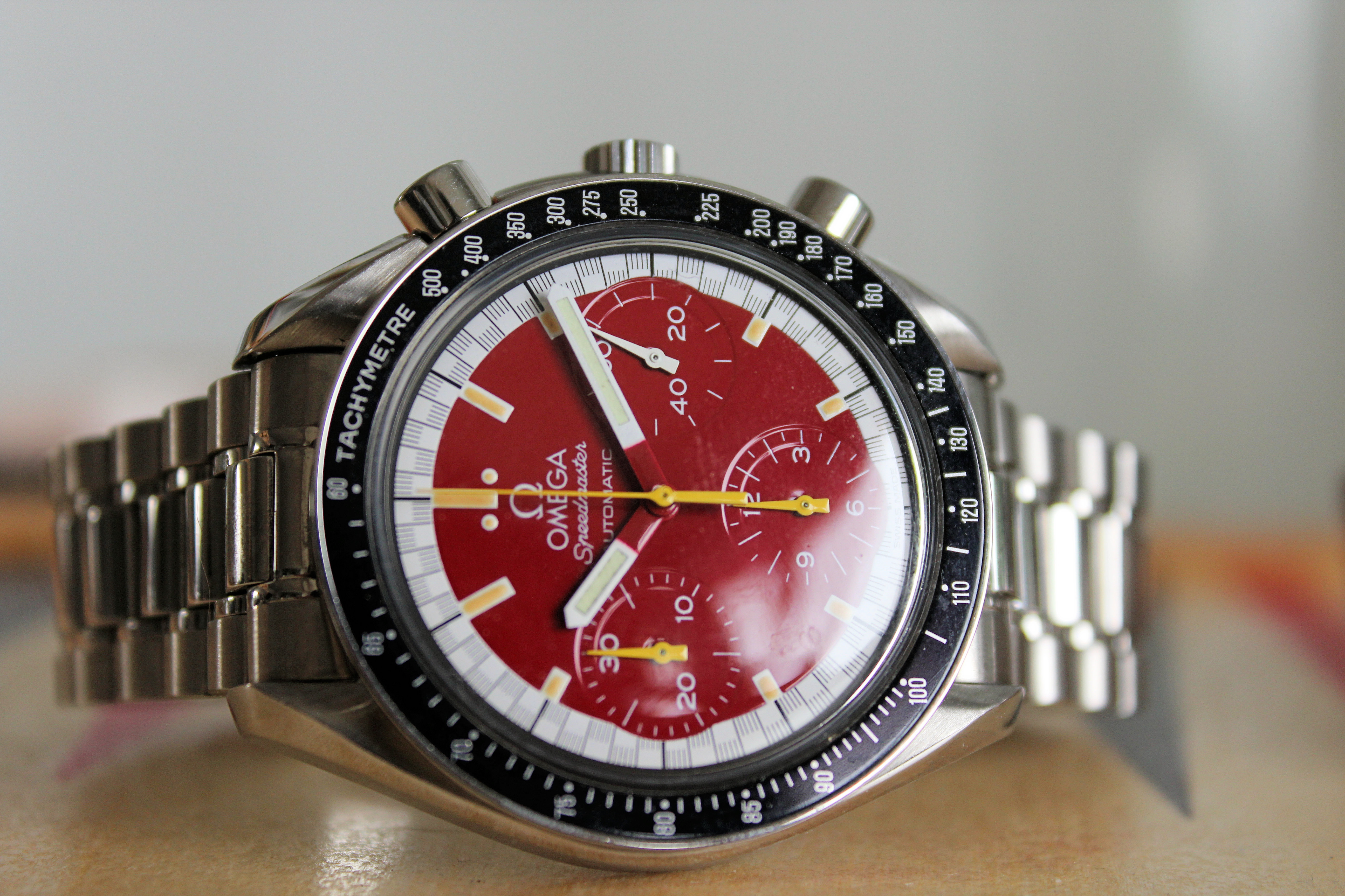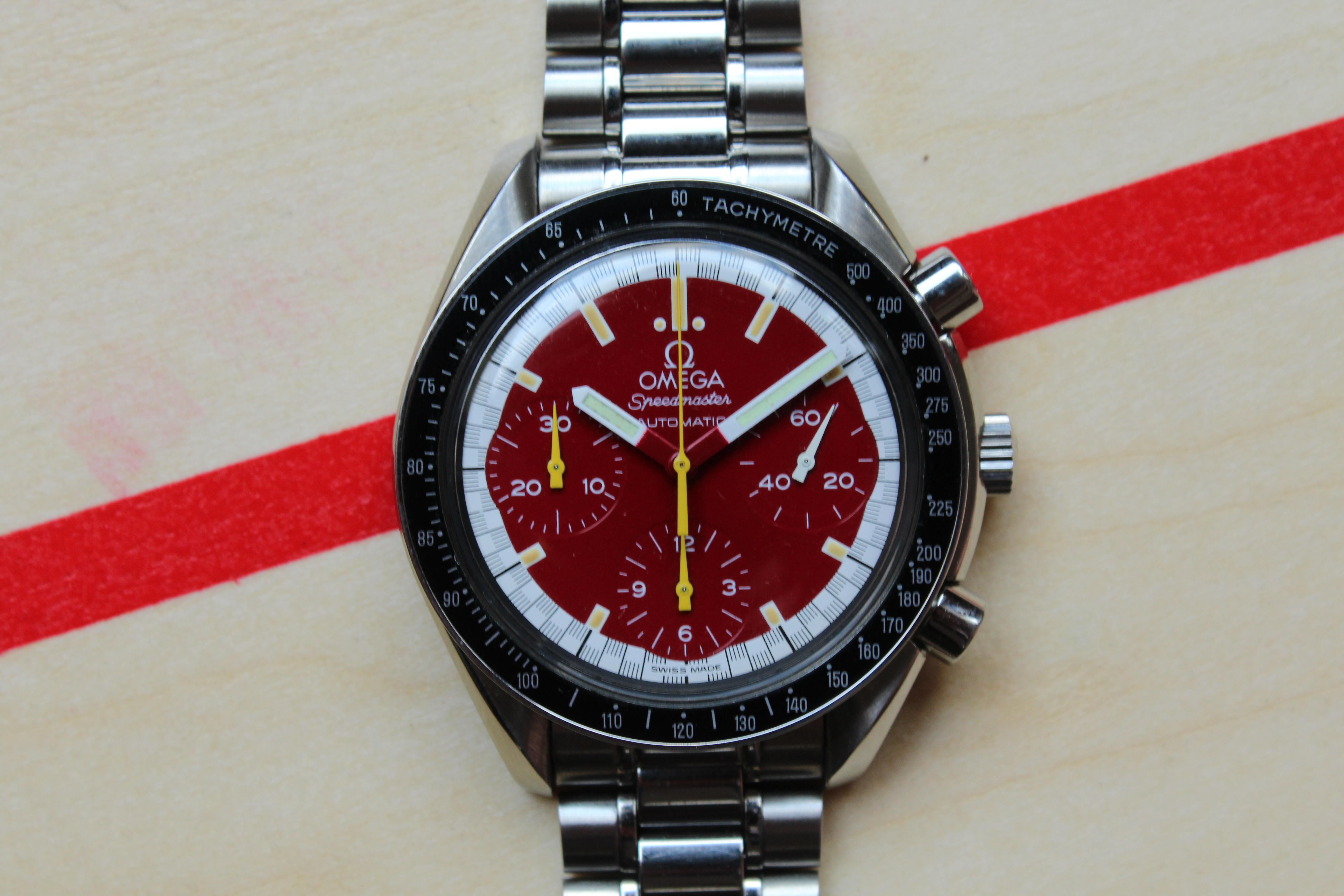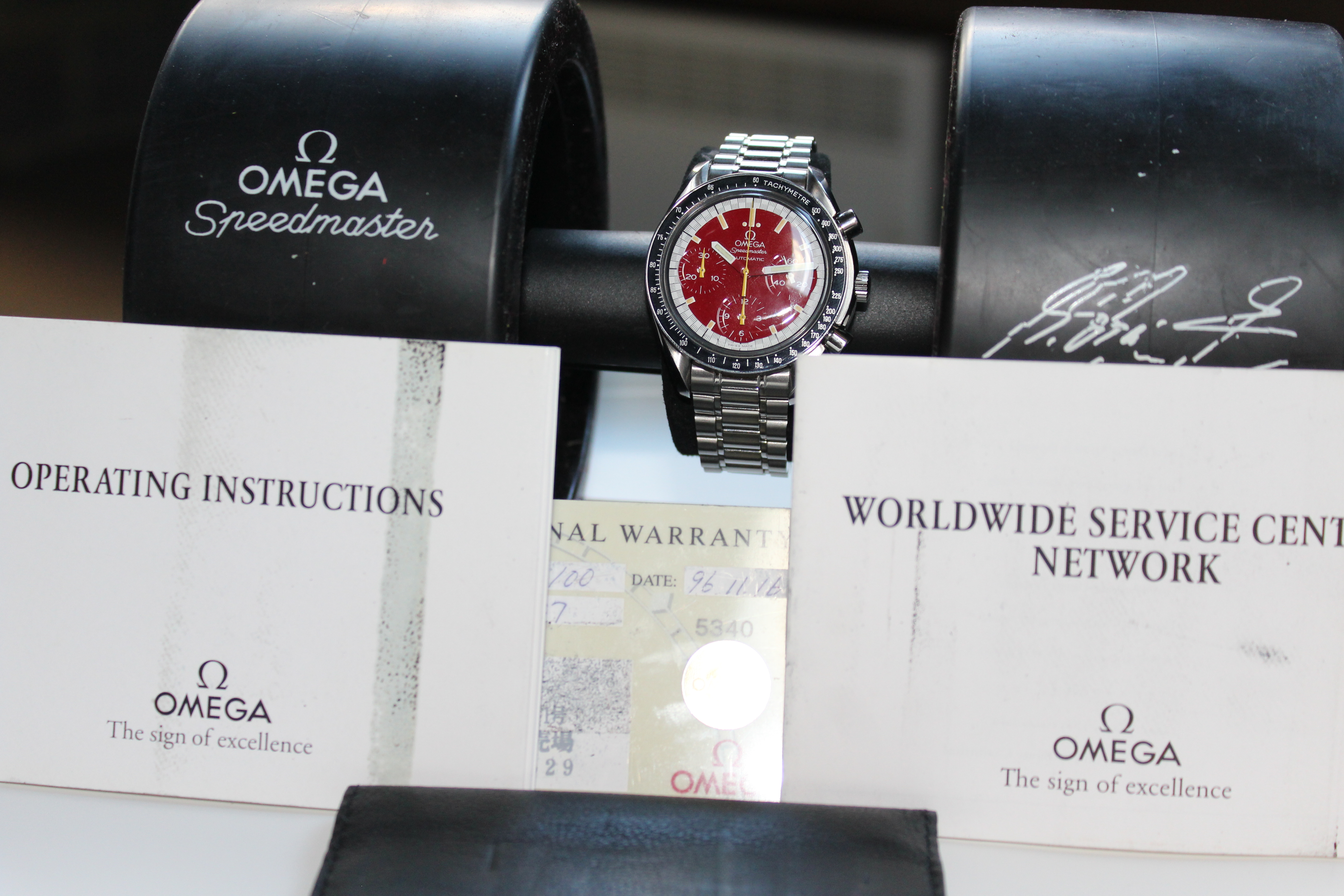 The Speedmaster Reduced Racing was launched in 1996 celebrating Omega brand ambassador Michael Schumacher’s signing with Ferrari F1. Fitted with a racing dial, influenced by the design of other important racing chronographs and painted in coordination with Ferrari’s paint department to make sure the color was correct with Ferrari spec. The model was in production for three years until 1999.