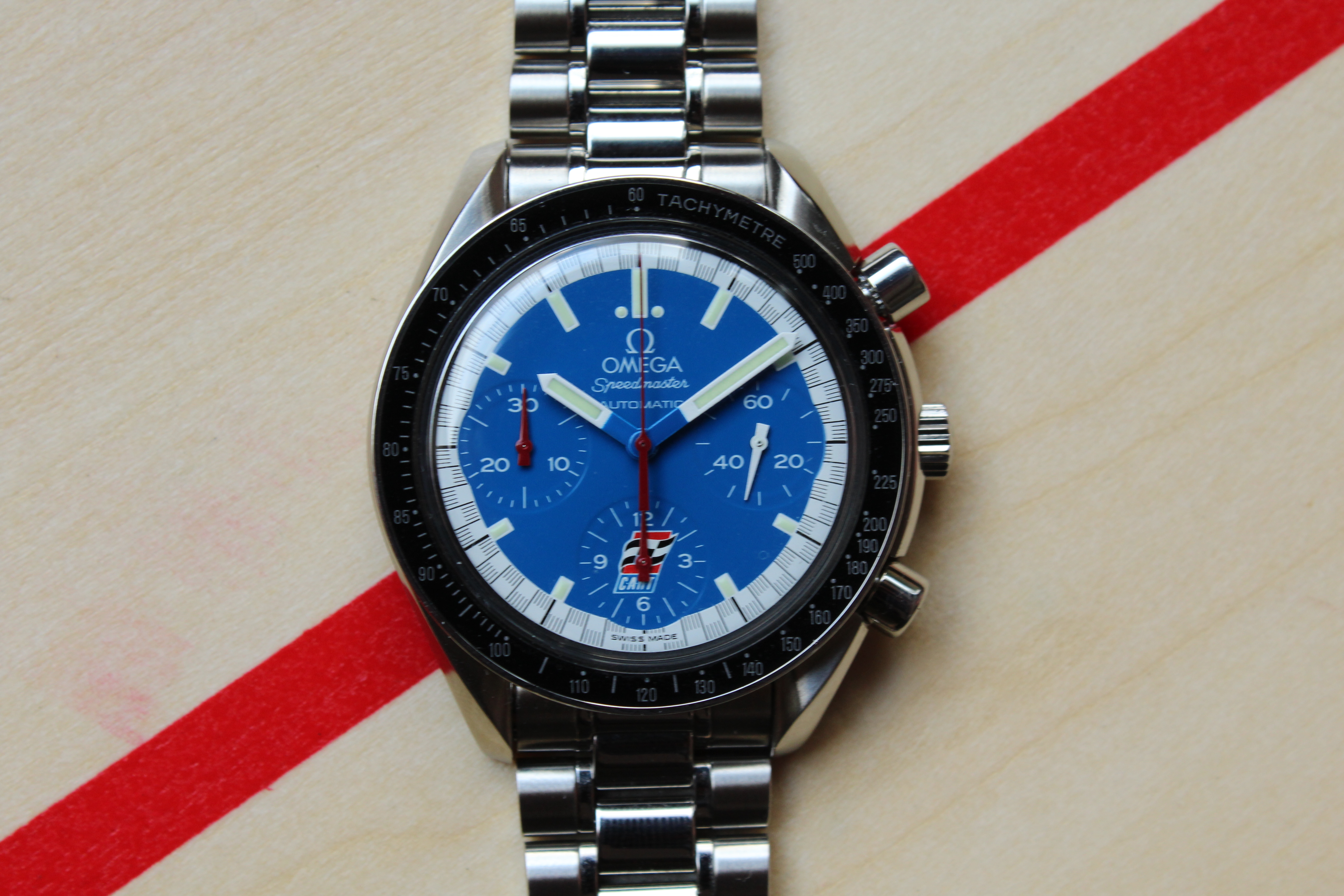 The Speedmaster Reduced Racing was launched in 1996 celebrating Omega brand ambassador Michael Schumacher’s signing with Ferrari F1. This blue CART version was launched in 1997 and was a collaboration between the Newman/Haas racing team (managed by Paul Newman and the influence of his love for the racing dials is obvious in this watch) Omega and Mario Andretti who was chosen as the brand ambassador. The model was in production for two years until 1999.